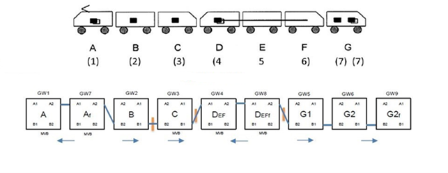 La rete di comunicazione del treno (TCN – Train Communication Network) è l’infrastruttura che permette la trasmissione dei dati all’interno dei treni. Essa ha una struttura gerarchica su N°2 livelli di rete, una dorsale WTB (Wire Train Bus) per la trasmissione dei dati lungo tutto il treno e le dorsali di livello inferiore MVB (Multifunction Vehicle Bus)/Ethernet per la connessione con i diversi dispositivi all’interno del singolo veicolo.